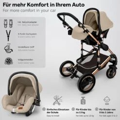 KIDUKU- 3 In 1 Combi-kinderwagen- Bruin/goud- Buggy Incl. Autostoeltje-regenhoes- Inklapbaar