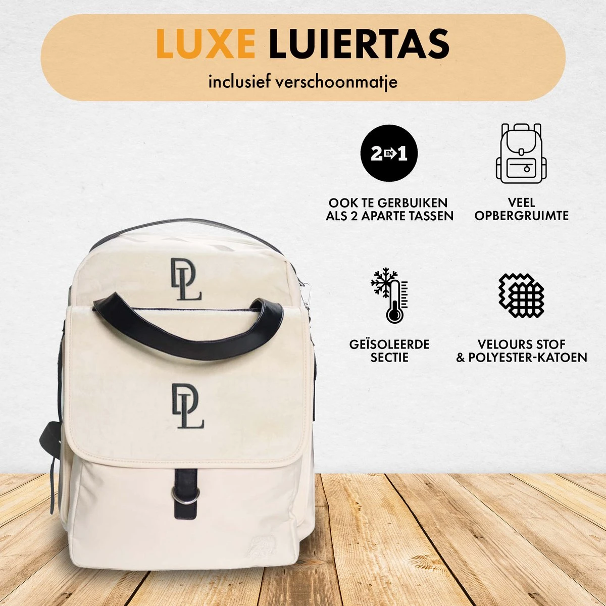 De stoere en stijlvolle tas van DERYAN bestaat uit drie delen. De grote rugtas is voorzien van verschillende opbergvakjes en is standaard uitgerust met een handig verschoonmatje. De tweede tas is door middel van ritsen bevestigd aan de voorkant van de rugtas en is te gebruiken als handtas. De voorzijde is gemaakt van zachte velours stof, wat deze tas een stijlvolle look geeft.