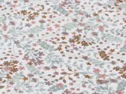 De kleuren van de bloemetjes en blaadjes zijn groen, roze en cognac op een witte ondergrond.