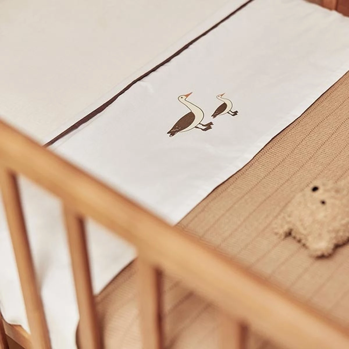 Ledikant lakentje met schattige gansjes. De zijkanten van het lakentje kun je onder het matrasje stoppen voor een extra veilig en geborgen gevoel. Je matcht dit lakentje met het schattige slaapzakje met gansjes. Style de kamer helemaal af met een biscuit kleurig hoeslaken en een klamboe in de matchende kleur.
