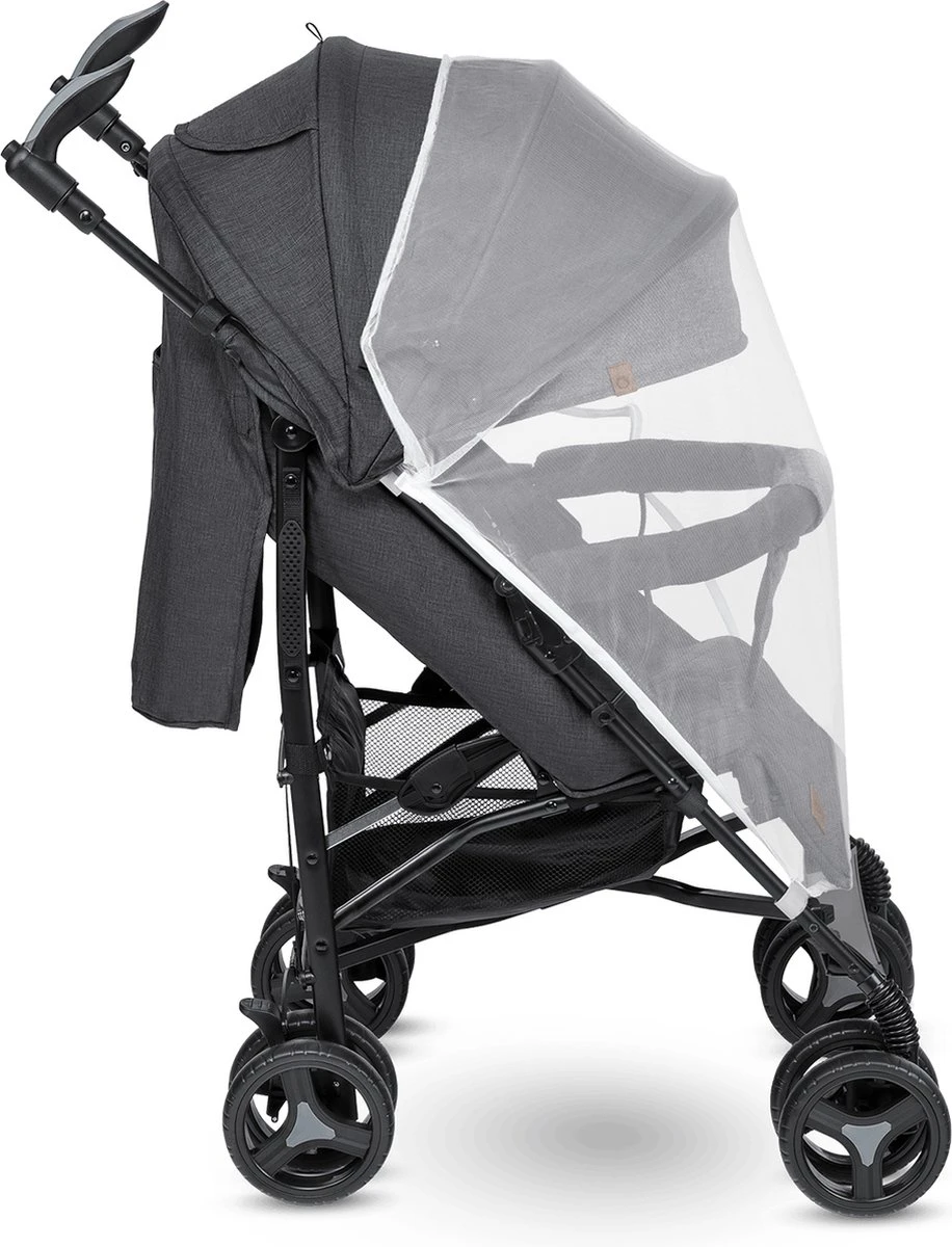 Het zakje aan de achterkant van de kinderwagen werkt perfect voor het opbergen van de handige accessoires van het kind of de portmonee/smartphone van de ouder.